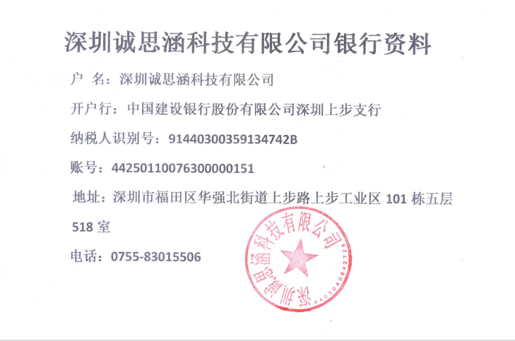 5、请不要把货款汇到其它任何帐户,诚思涵科技只对以下帐户负责!